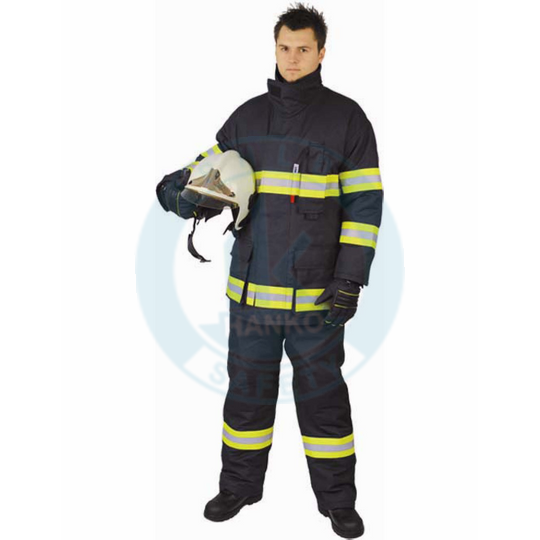 Áo: Có khóa kéo trước áo, phần tay áo được may cuốn ở cổ tay, dán kín, có 02 túi để đựng dụng cụ loại nhỏ phục vụ pccc, có dãy phản quang 5cm. Trọng lượng chất liệu vải 265g/m2. Đường may Nomex. Chịu được nhiệt độ 1000C. Chịu được ngọn lửa trần: 2-7s
