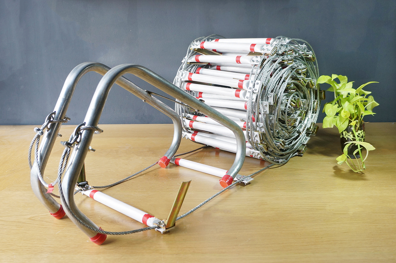 Thang dây thoát hiểm chống cháy, thang dây thoát hiểm được thiết kế có thể xếp gọn nhẹ khi có hỏa hoạn móc một đầu thang vào cửa sổ, lan can sau đó thả thang dây xuống và bắt đầu leo xuống đất, thang cho phép xuống nhiều người cùng lúc, bậc thang hình chữ U tựa vào tường khi bước xuống tạo độ vững chắc an toàn.