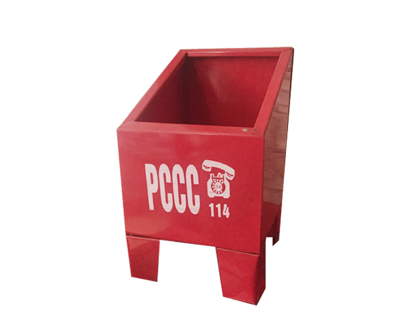 Bề mặt trước của kệ đựng bình chữa cháy có sơn chữ PCCC 114 màu trắng để nhận biết.